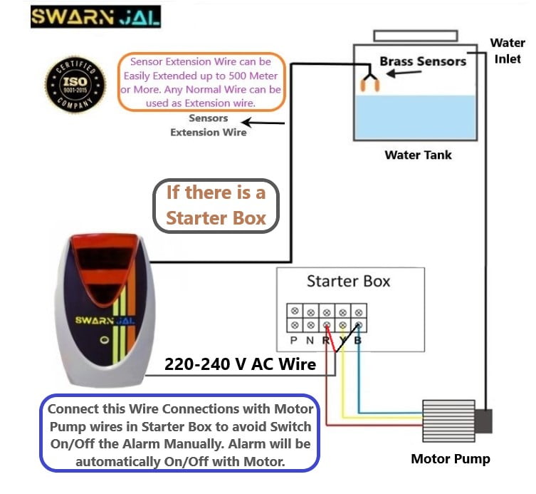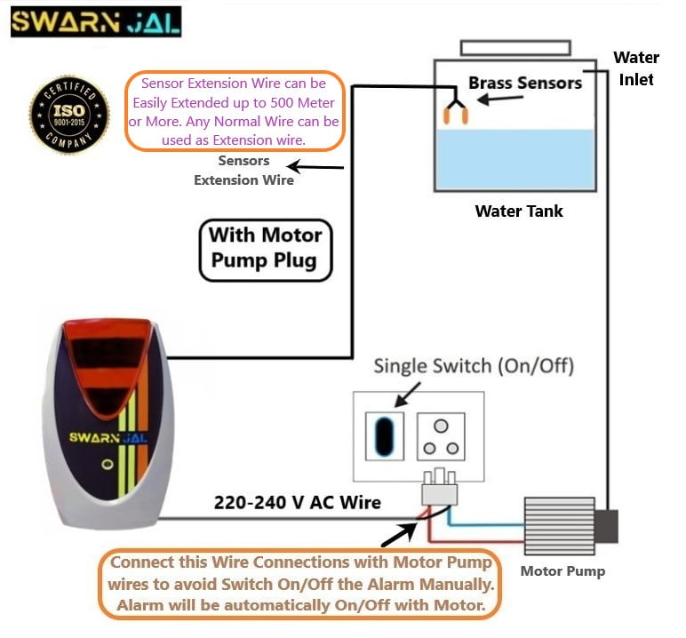 Open the Box and User will see the main device with 2 brass sensors which are attached with two wires to the device. Now Cut these both Sensors wires from the Middle and connect the Extension Wire. Extension wire Can be Extended up to 1000 Meters easily. Now attach the sensors to the ends of the extension wire. Now place the sensors in the water tank at your convenient location where you want to receive the alarm.