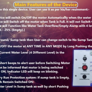 Dry Run Protection for Sump/Underground tank users. It shows water level status in Sump tank as well.