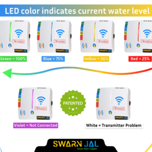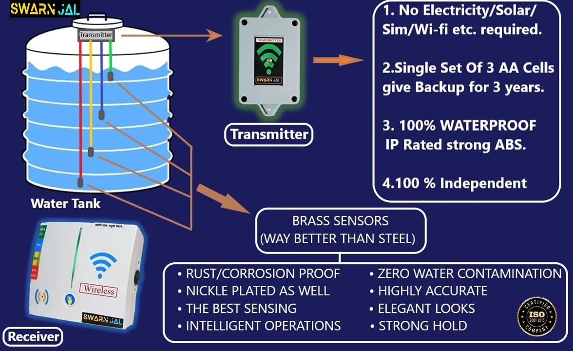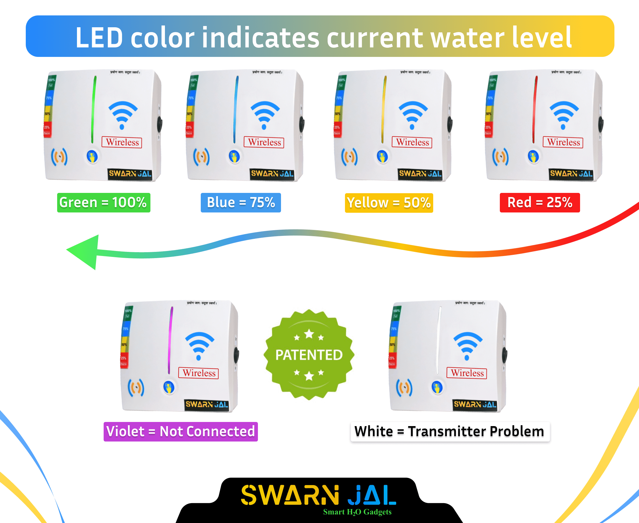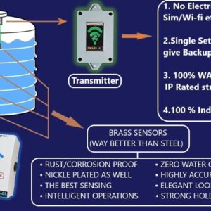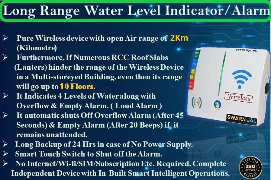(यह पूरी तरह से इंडिपेंडेंट वायरलेस डिवाइस पानी के चार लेवल को कलर इंडिकेटरस का उपयोग करके दिखाता है और साथ ही में ओवेरफ़्लो और रिजर्व लेवल पर अलार्म देता है। इसे इंस्टॉल करने के बाद इंटरनेट कनेक्शन, ब्लूटूथ या सिम कार्ड की आवश्यकता नहीं है। और ना ही कोई मासिक या वार्षिक सब्सक्रिप्शन इत्यादि की जरूरत है – इसे बस एक बार इंस्टॉल करें और भूल जाएं!
