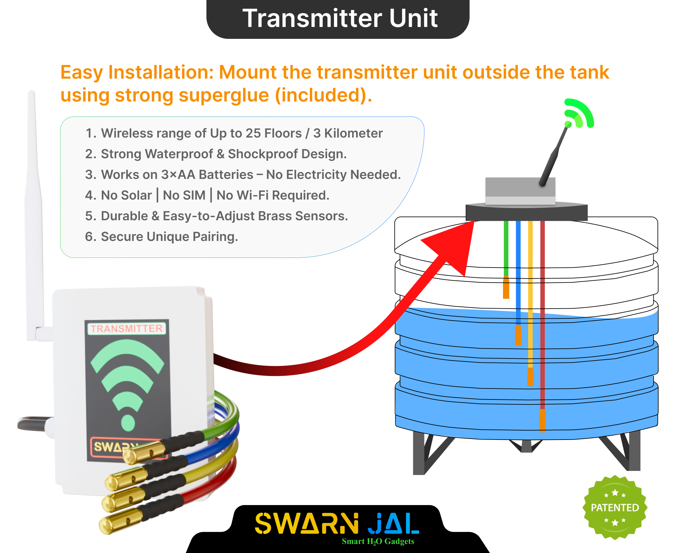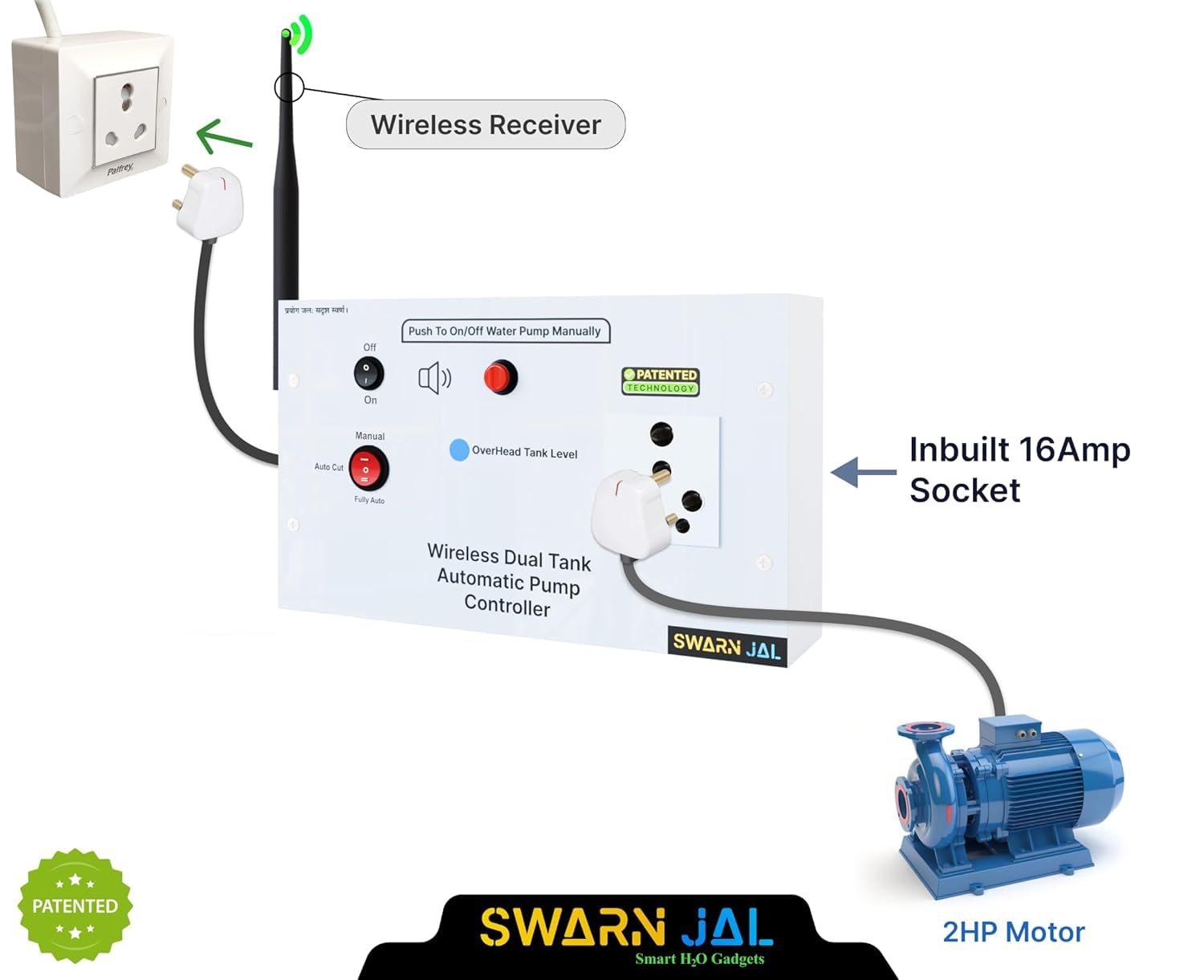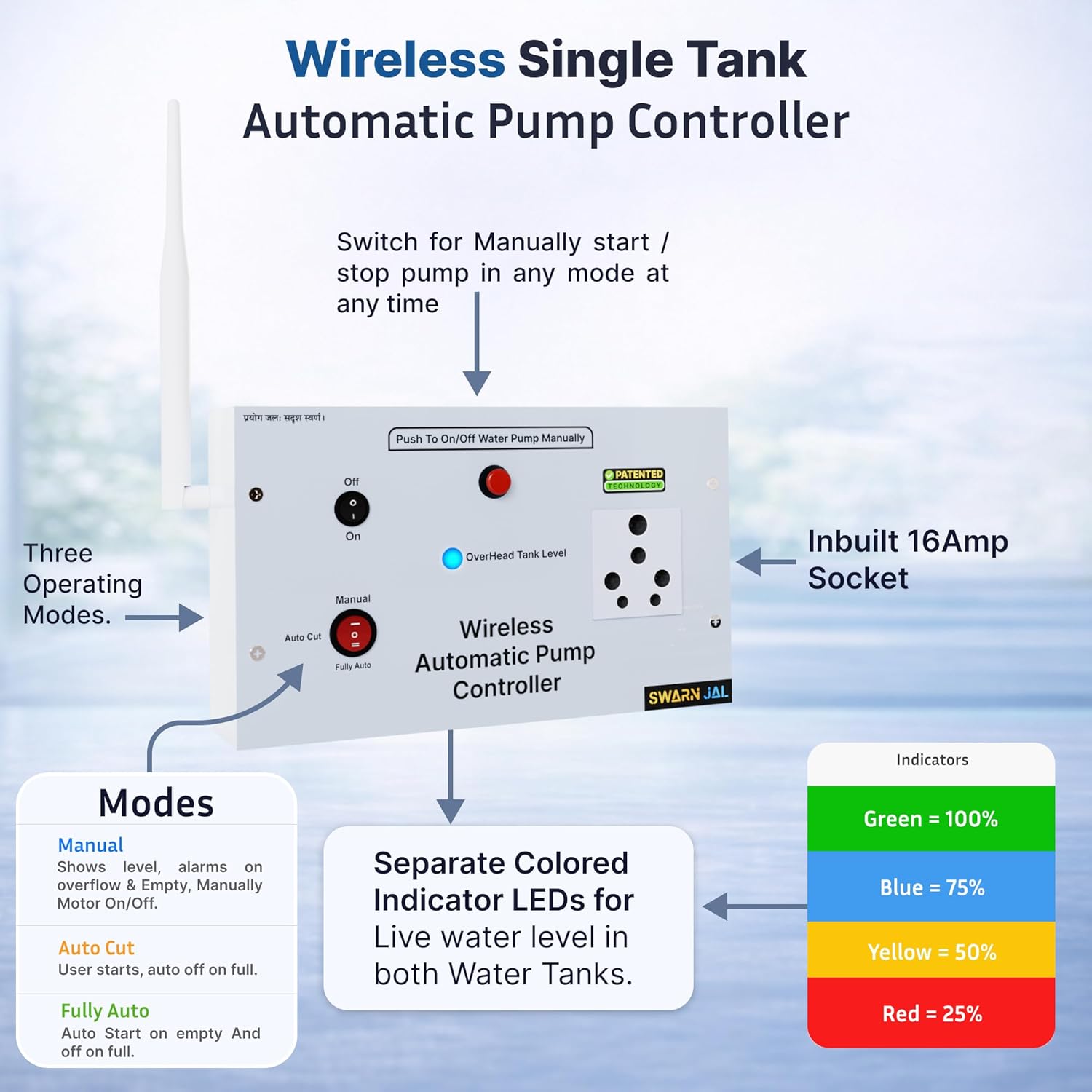 Swarn Jal Wireless Water Level Controller for MonoBlock/Tullu Pumps, 25 Floors Strong Wireless Range, 3 Selectable Modes, Automatic Fill Water Tank, 1 Year Warranty| Model: WL-A-SM