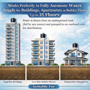 • Wireless Long Range up to 25 Floors/ 3 KM. No need of connecting wire among Water Motor, Controller/Receiver & Overhead tank.