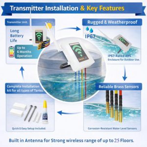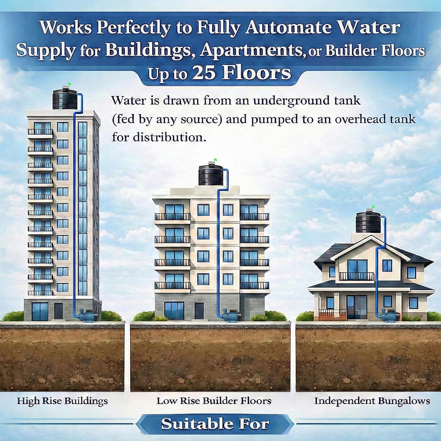 • वायरलेस लंबी रेंज: 25 मंजिलों याकिमी तक, पानी की मोटर, कन्ट्रोलर/रीसीवर और पानी की टंकी  के बीच वायरिंग की आवश्यकता को खत्म करता है।