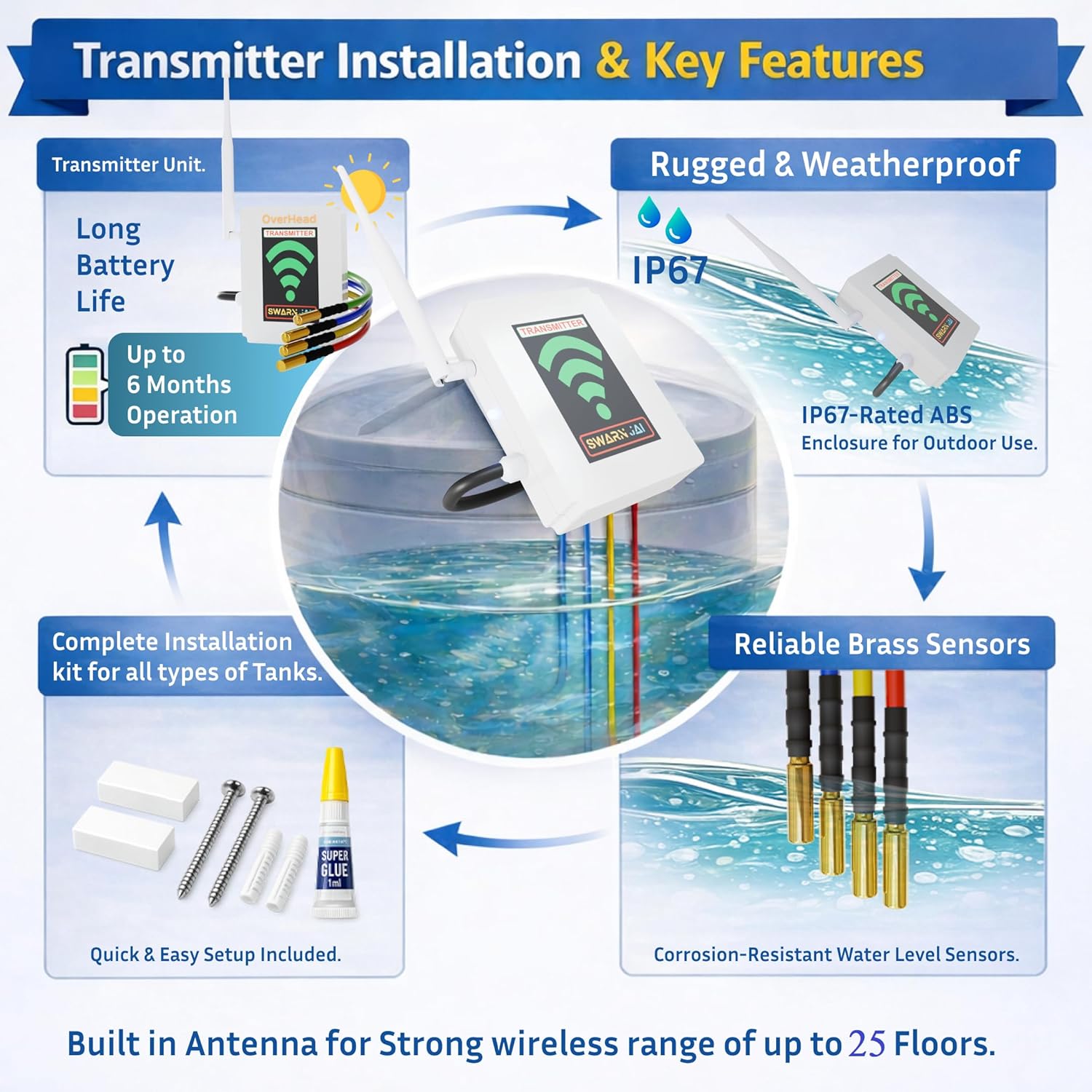 24 reviews for Swarn Jal Wireless Water Level Controller for MonoBlock/Tullu Pumps, 25 Floors Strong Wireless Range, 3 Selectable Modes, Automatic Fill Water Tank, 1 Year Warranty| Model: WL-A-SM
